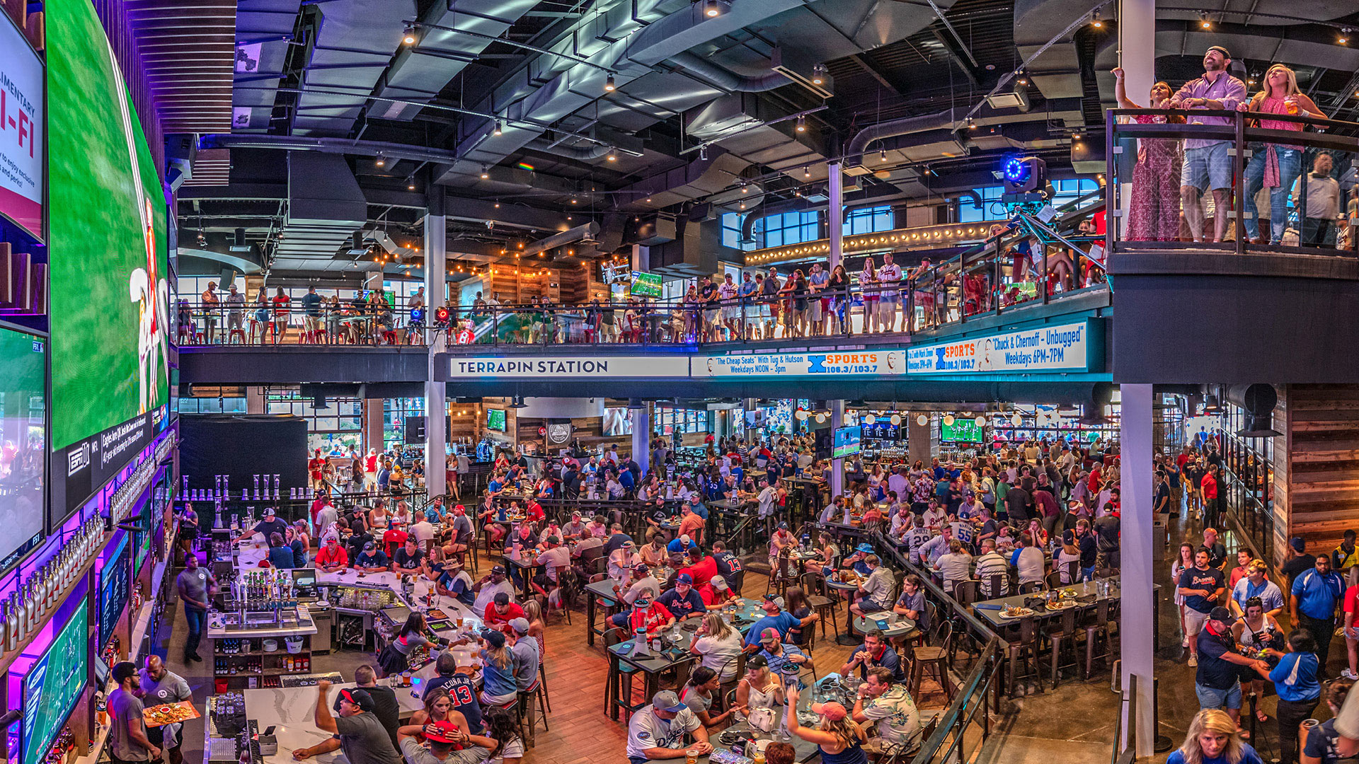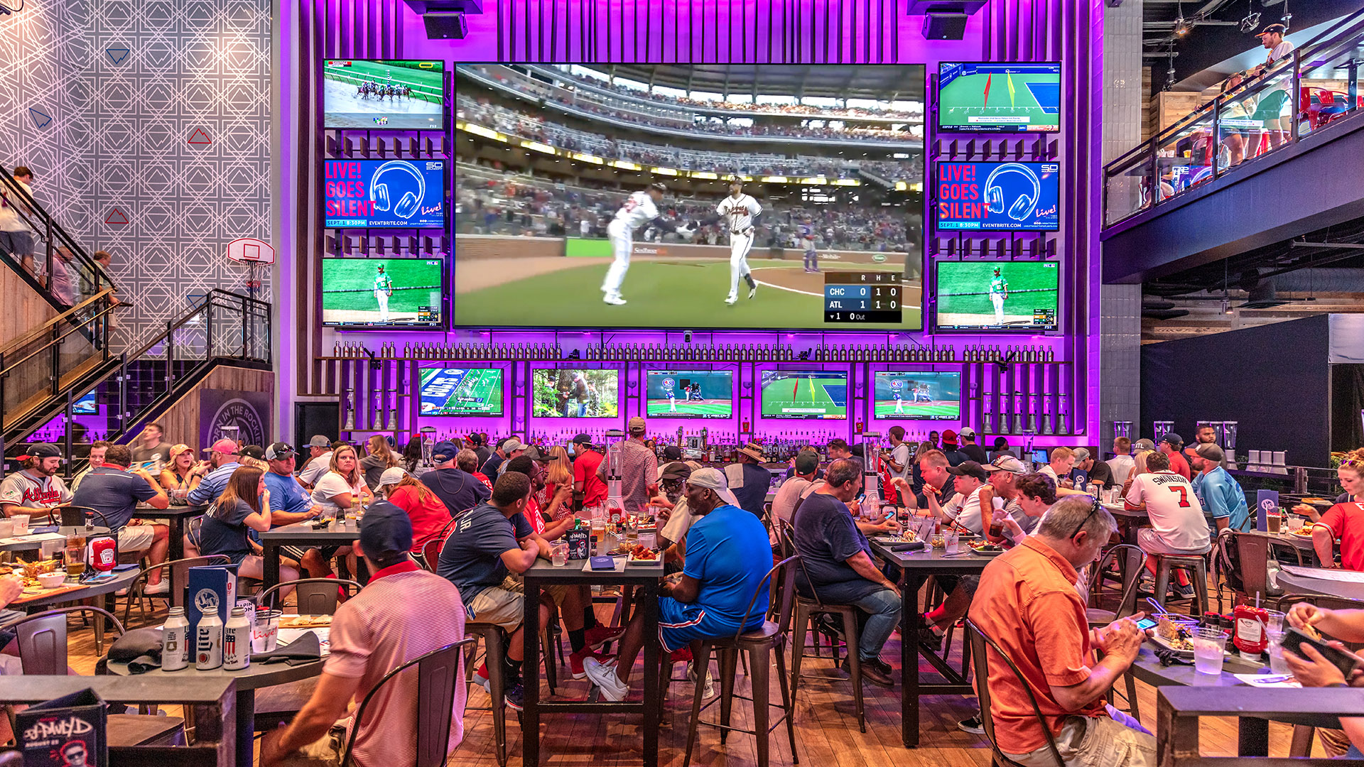 Designed by Jeffrey Beers International, the dynamic, two-story collection of bars, restaurants and gaming areas at Live! at the Battery Atlanta has ample outdoor space for socializing before or after a game.